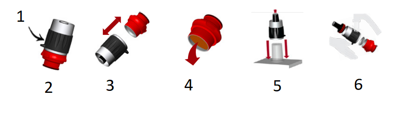 - Retire el pistón con el vaso dosificador. Coloque el cilindro sobre el vaso dosificador y presione sobre una superficie dura.
