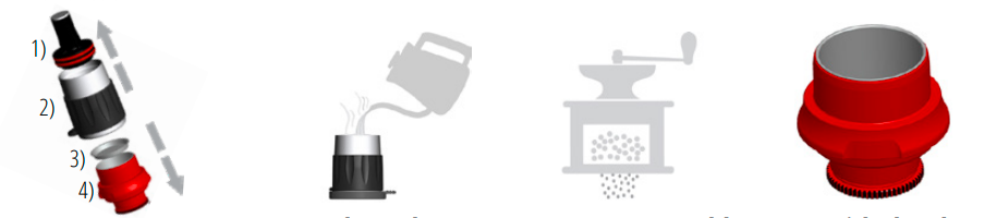 - Separe el cabezal de preparación : separe el cabezal de preparación en cuatro partes: 1) pistón, 2) cilindro de preparación, 3) malla, 4) portafiltro. Consejo: Use el vaso dosificador para retirar el pistón.