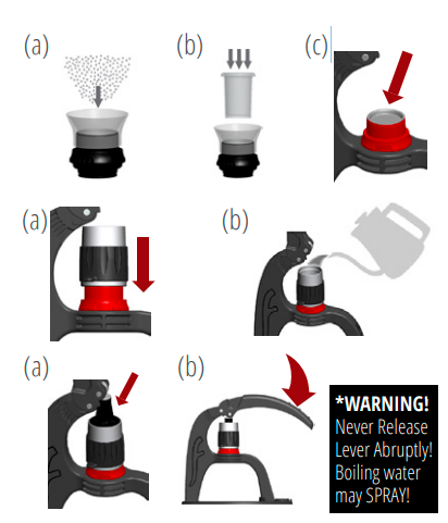 (a) Coloque el embudo en el Portafilter seleccionado y llénelo con (a) Vacíe el agua precalentada, retire Preheat cap y (a) Coloque el pistón en la parte superior del cilindro. (b) Presione lentamente el *¡ADVERTENCIA! - ¡Nunca suelte la palanca bruscamente! ¡El agua hirviendo puede salir despedida! | ![]() |