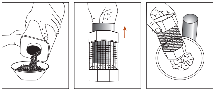 Deje que la chimenea de aluminio se enfríe por completo durante varios minutos. Una vez enfriada, retire la tapa del recolector de granzas, retire la chimenea de aluminio y vacíe las granzas en el compost. Quizás pueda preparar varios asados antes de tener que vaciar el recolector de granzas, pero no deje que se llene más allá de la mitad de la malla. Después de vaciarlo, asegúrese de que la chimenea de aluminio esté colocada y completamente asentada en la pieza de plástico.