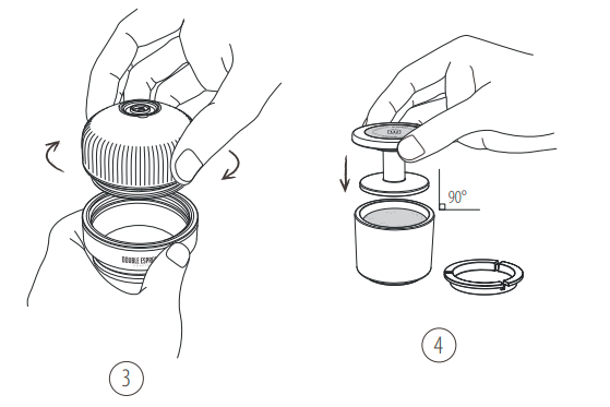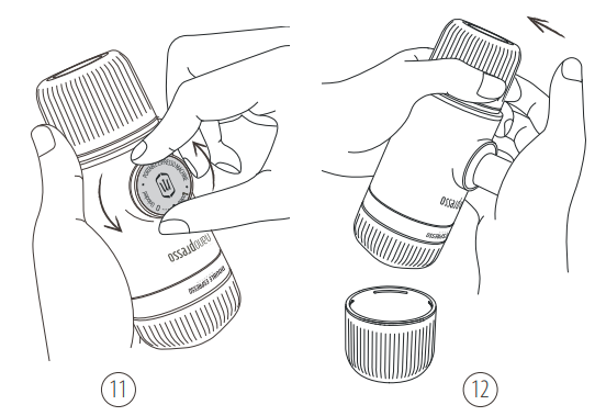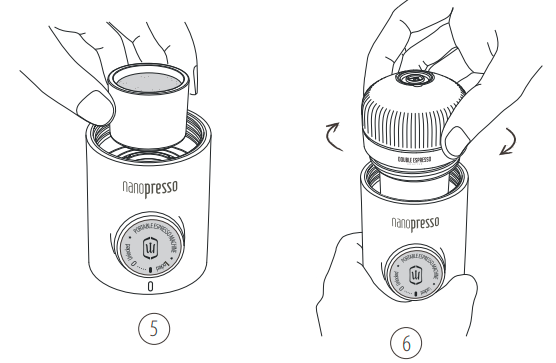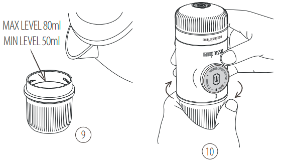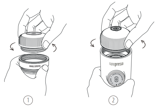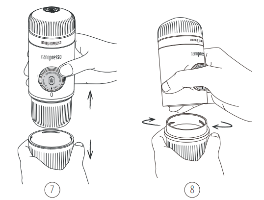 11. Desbloquee el pistón de su posición de recorrido. 12. Sujete el NanoPresso con ambas manos, como se muestra. Empiece a bombear sobre una taza. Bombee lentamente hasta que salga todo el café. | ![]() |