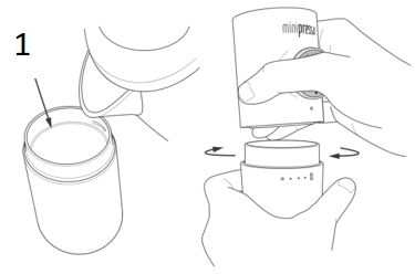Llene el depósito de agua según el riesgo. Alinee el cuerpo de su MiniPresso con el punto del depósito y colóquelo en el depósito girándolo en sentido horario.